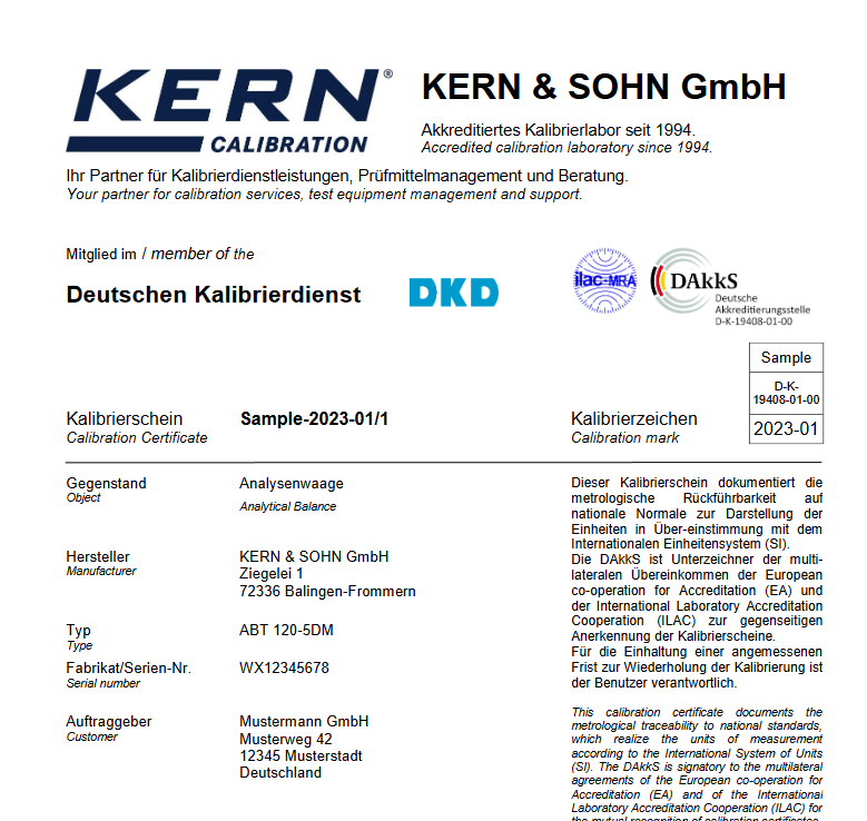 El laboratorio de calibración KERN del DAkkS (D-K-19408-01-00) está acreditado por la Deutsche Akkreditierungsstelle GmbH. El certificado de calibración DAkkS está reconocido internacionalmente y disponible en muchos idiomas.