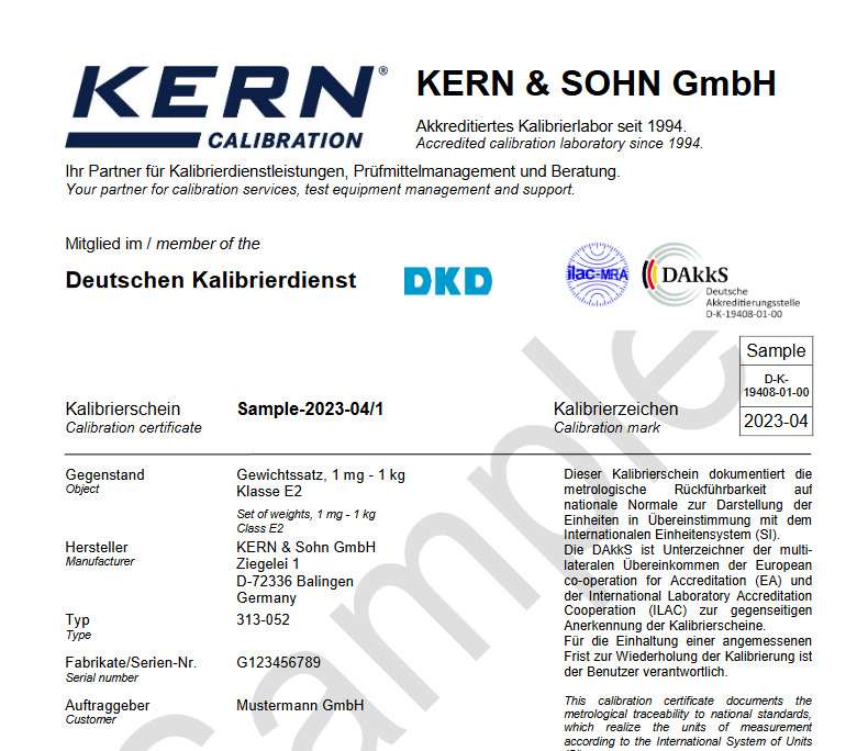 El laboratorio de calibración KERN del DAkkS (D-K-19408-01-00) está acreditado por la Deutsche Akkreditierungsstelle GmbH. El certificado de calibración DAkkS está reconocido internacionalmente y disponible en muchos idiomas.